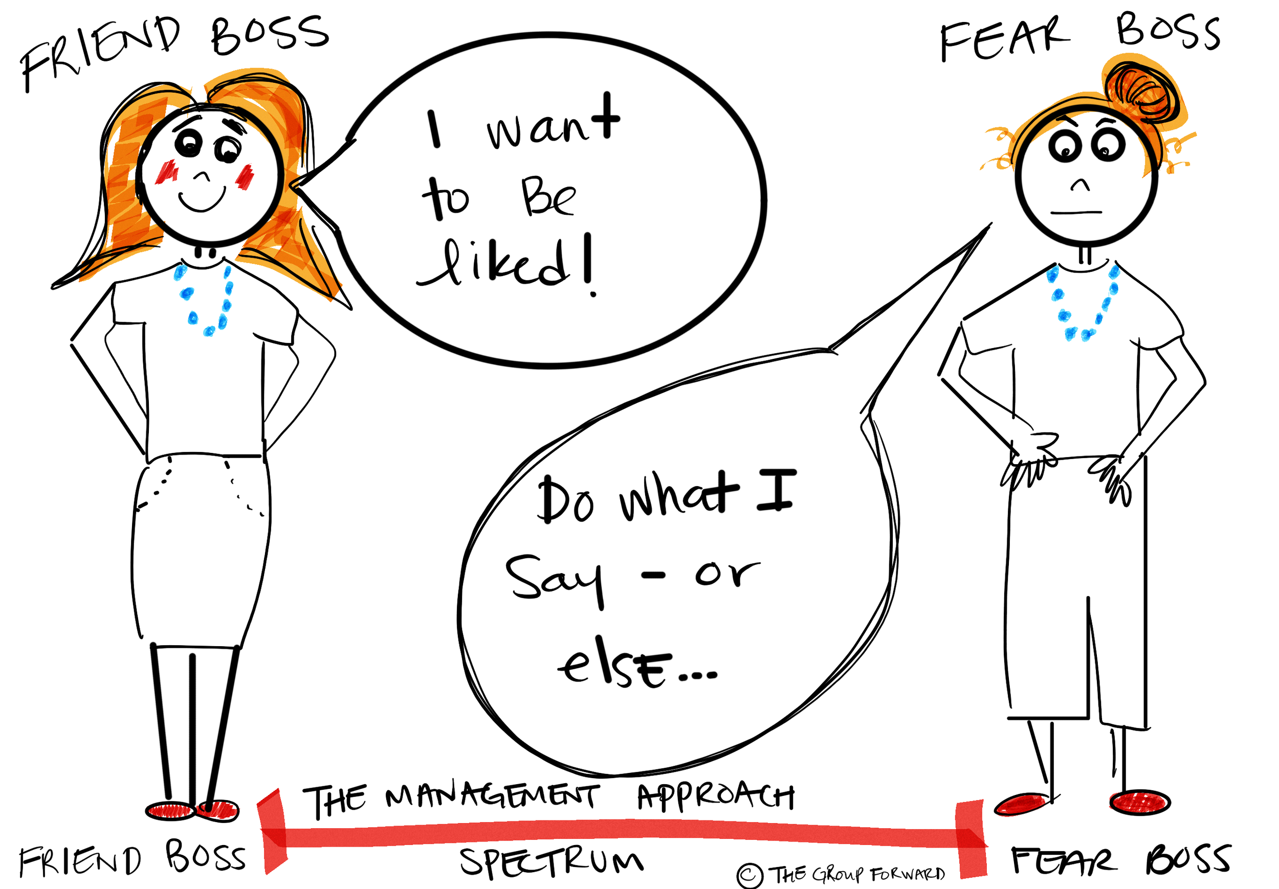 In The Harvard Business Review Manager's Handbook: The 17 Skills Leaders Need to Stand Out, they lay out a pretty handy management spectrum. At one end of the spectrum is the Friend Boss: leaders who strive to be liked, and at the other end is the Fear Boss: leaders who demand compliance.